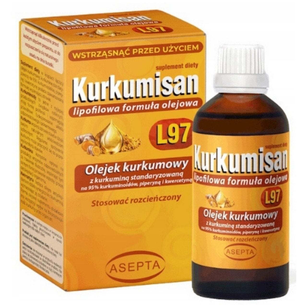 Asepta Kurkumisan Turmeric Oil is a dietary supplement in the form of drops. It contains oil from turmeric rhizomes (Curcuma longa), turmeric extract standardised to 95% curcuminoids, black pepper extract standardised to 95% piperine, quercetin and manganese in extra virgin olive oil. The formula is enriched with rosehip oil. Daily dose: 5 drops 2-3 times a day. Does not contain: gluten, lactose, GMOs, artificial colours.
