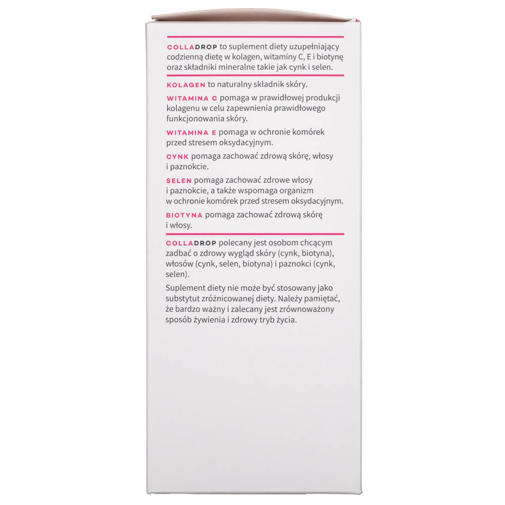 Vand, NatiCol ® kollagen fra huden på havfisk, sødemiddel: invertsukker, L-ascorbinsyre (C-vitamin), zinkgluconat, konserveringsmiddel: kaliumsorbat, D-alfa-tocopherol (E-vitamin), natriumselenit, D-biotin.