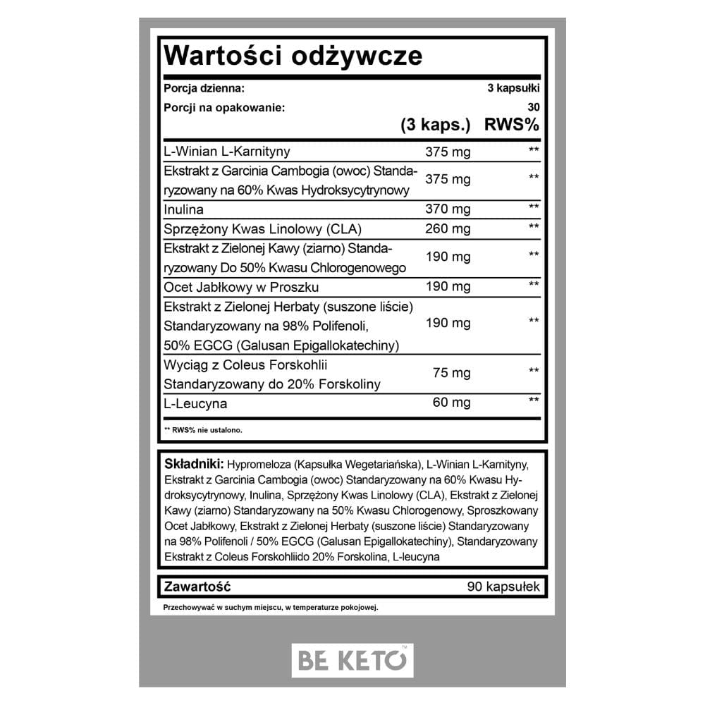 Hypromellose ( Vegetarisk kapsel ) , L-carnitintartrat , Garcinia cambogia-ekstrakt ( frugt ) Standardiseret til 60 % Hydroxycitronsyre , Inulin , Konjugeret linolsyre , Grøn kaffeekstrakt ( korn ) Standardiseret til 50 % Chlorogensyre , Æblecidereddike pulver , Grøn teekstrakt ( tørrede blade ) Standardiseret til 98 % polyfenoler , 50 % EGCG ( Gallusan Epigallocatechin ) , Coleus Forskohilia-ekstrakt Standardiseret til 20 % Forskolin , L-Leucin.