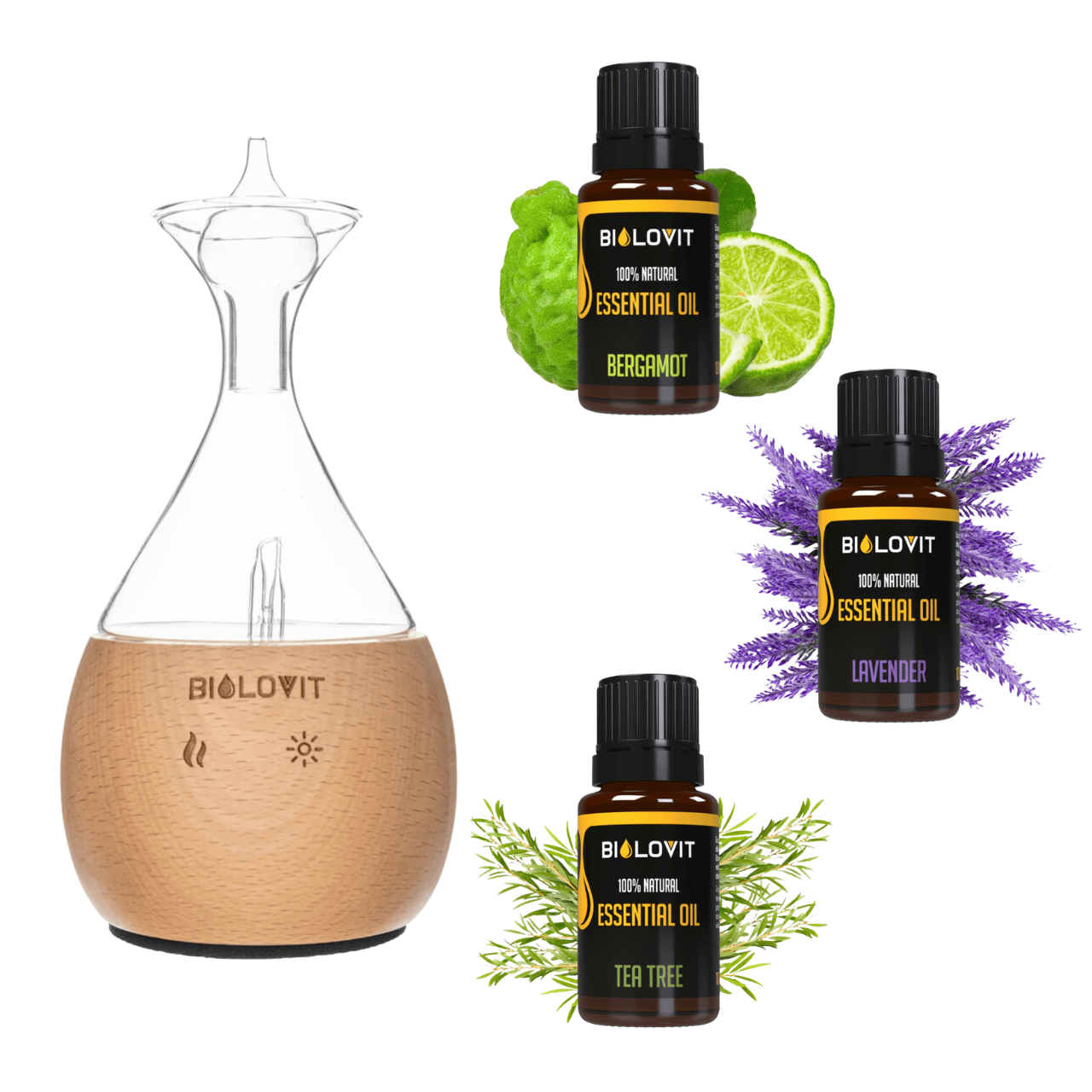 Sættet indeholder en forstøver samt 3 æteriske olier - bergamot , lavendel og tea tree . Bilovit-forstøveren til æteriske olier er et avanceret apparat, der udnytter alle fordelene ved aromaterapi – fremme af sundhed og velvære. Takket være sin unikke virkningsmekanisme er den et fremragende alternativ til traditionelle metoder til duftterapi, samtidig med at den bevarer alle dens fordele. Forstøveren er ikke kun funktionel, men også et smukt stykke boligudstyr og dekoration.