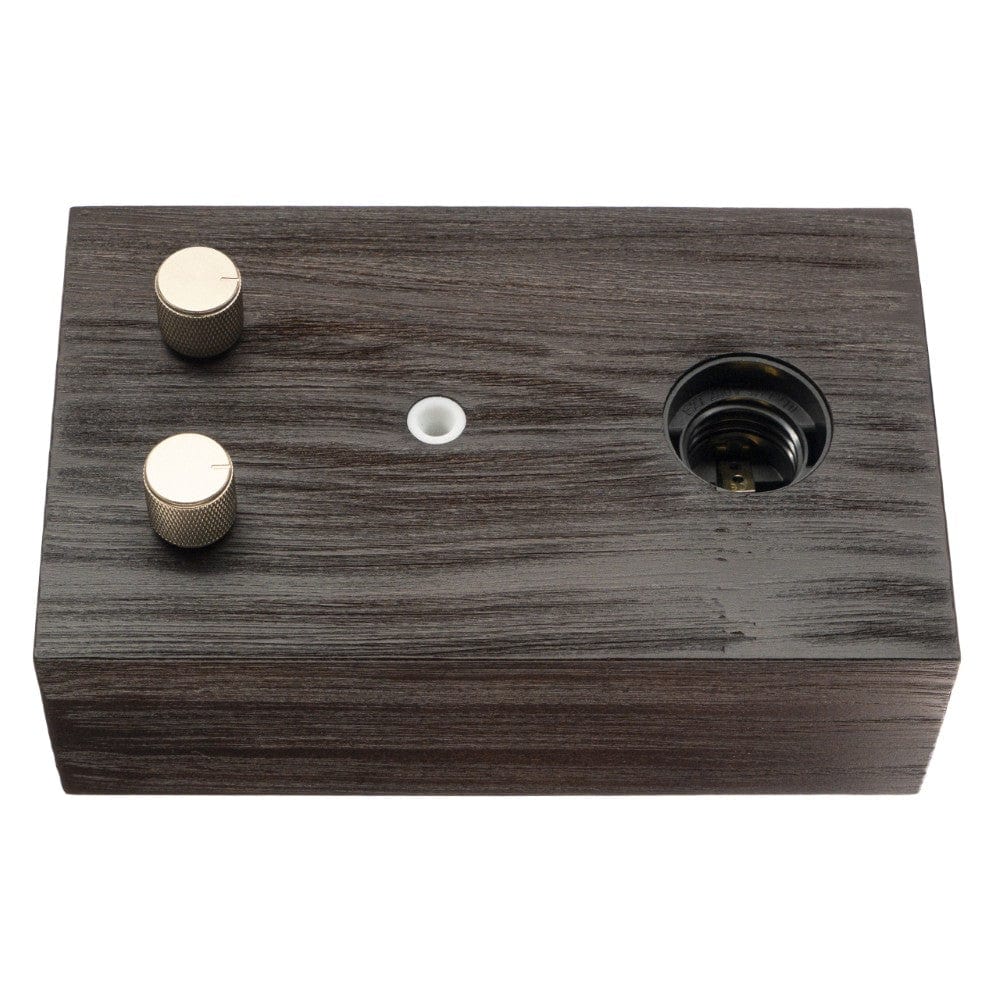 - En base af fyrretræ, glasflaske , pære og metalskruer – holdbarhed og elegance i ét.