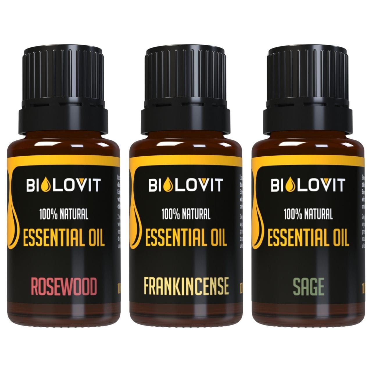 Sæt med æteriske olier til meditation fra Bilovit. Meditationssættet består af olier - rosentræ , røgelse og salvie .