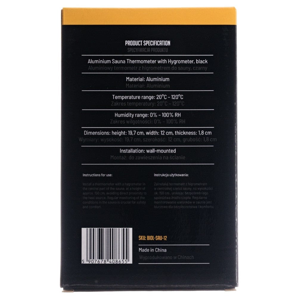 Bilovit termometer med hygrometer er en vigtig enhed til overvågning af nøgleparametre i saunaen. Fremstillet af holdbart aluminium i en elegant sort farve, måler dette stilfulde produkt nøjagtigt både temperatur og luftfugtighed, og sikrer optimale saunaforhold. Dets minimalistiske design og solide konstruktion gør, at det passer perfekt til enhver sauna, fra moderne til traditionelt træinteriør.