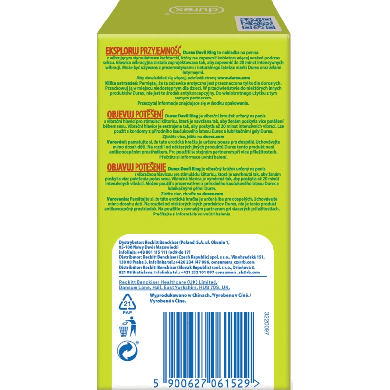 Durex Devil Ring er en penispude med vibrerende klitorisstimulator designet til at give kvinder mere følelse under sex. Det vibrerende hoved er designet til at give op til 20 minutters intens vibration . Det kan bruges med Durex naturlige latexkondomer og intime geler.