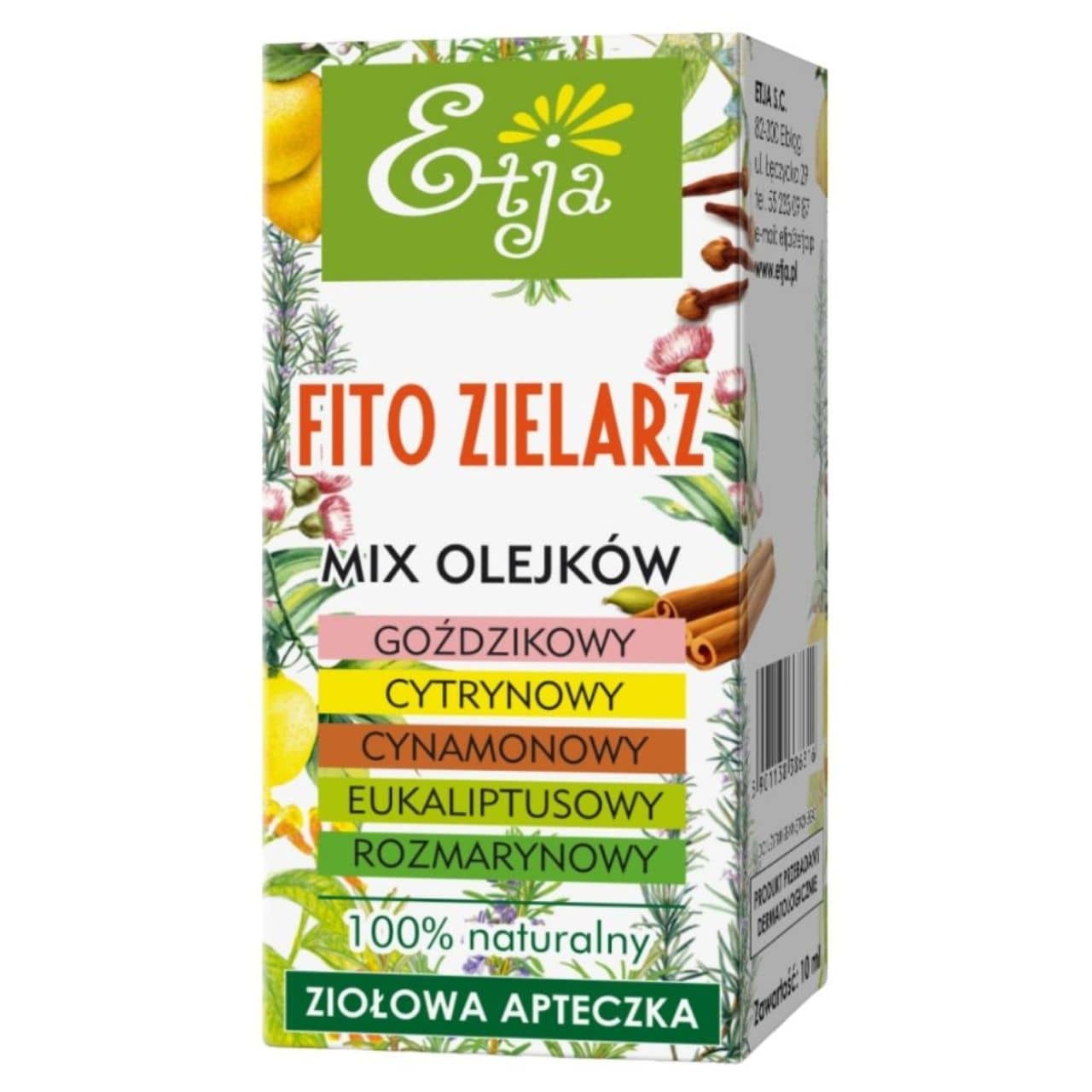 Fito Zielarz olie er en professionel blanding af 5 naturlige æteriske olier : citron, kanel, eukalyptus, nellike og rosmarin. Opvarmende og forfriskende , med en intens krydret citrusaroma. Støtter immunforsvaret, hjælper mod luftvejsinfektioner og reumatiske smerter. 100% naturlig , certificeret formel!
