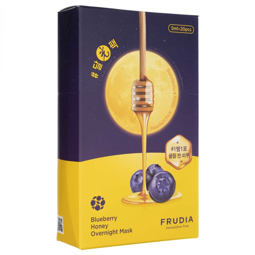 Frudia Blueberry Honey Overnight Mask er en nærende, natmaske baseret på fugtgivende blåbærekstrakt, der blødgør, udglatter og beroliger din hud. Derudover, er dette produkt beriget med nærende sheasmør og stærkt fugtgivende betain for at give omfattende pleje. Sættet indeholder 20 masker .