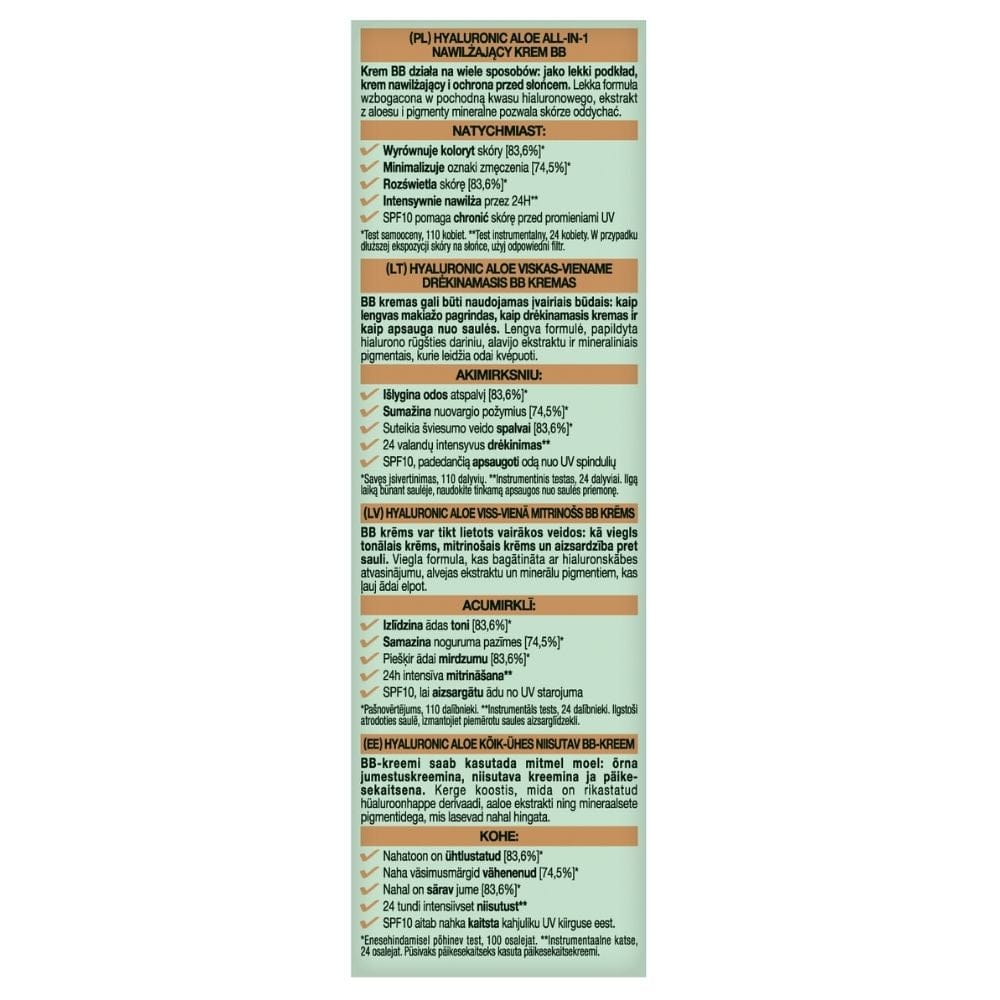 Garnier BB Cream er et multifunktionelt produkt, der kombinerer egenskaberne ved en let foundation, fugtighedscreme og solbeskyttelse. Dens lette formel, beriget med et hyaluronsyrederivat, aloe vera-ekstrakt og mineralpigmenter, giver huden mulighed for at ånde og er velegnet til alle hudtyper. BB-cremen udjævner øjeblikkeligt hudtonen, minimerer tegn på træthed, lysner teinten og fugter intenst i 24 timer, samtidig med at den giver SPF10-beskyttelse .