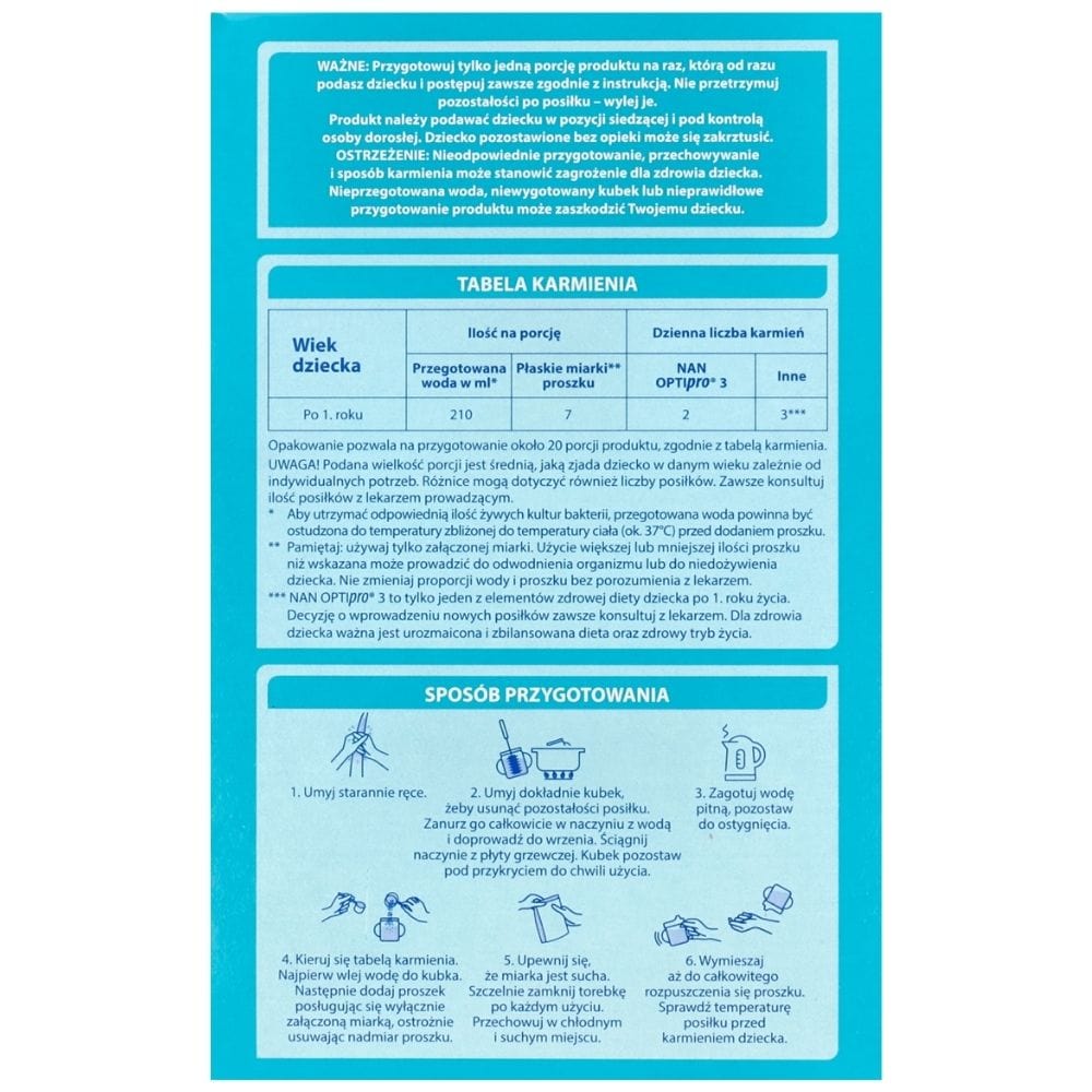 NAN OPTIpro 3 er et mælkebaseret produkt beregnet til små børn. Beriget med vitaminer og mineraler. Det er ikke en erstatning for modermælk, men et produkt udviklet med børn over 1 år i tankerne
