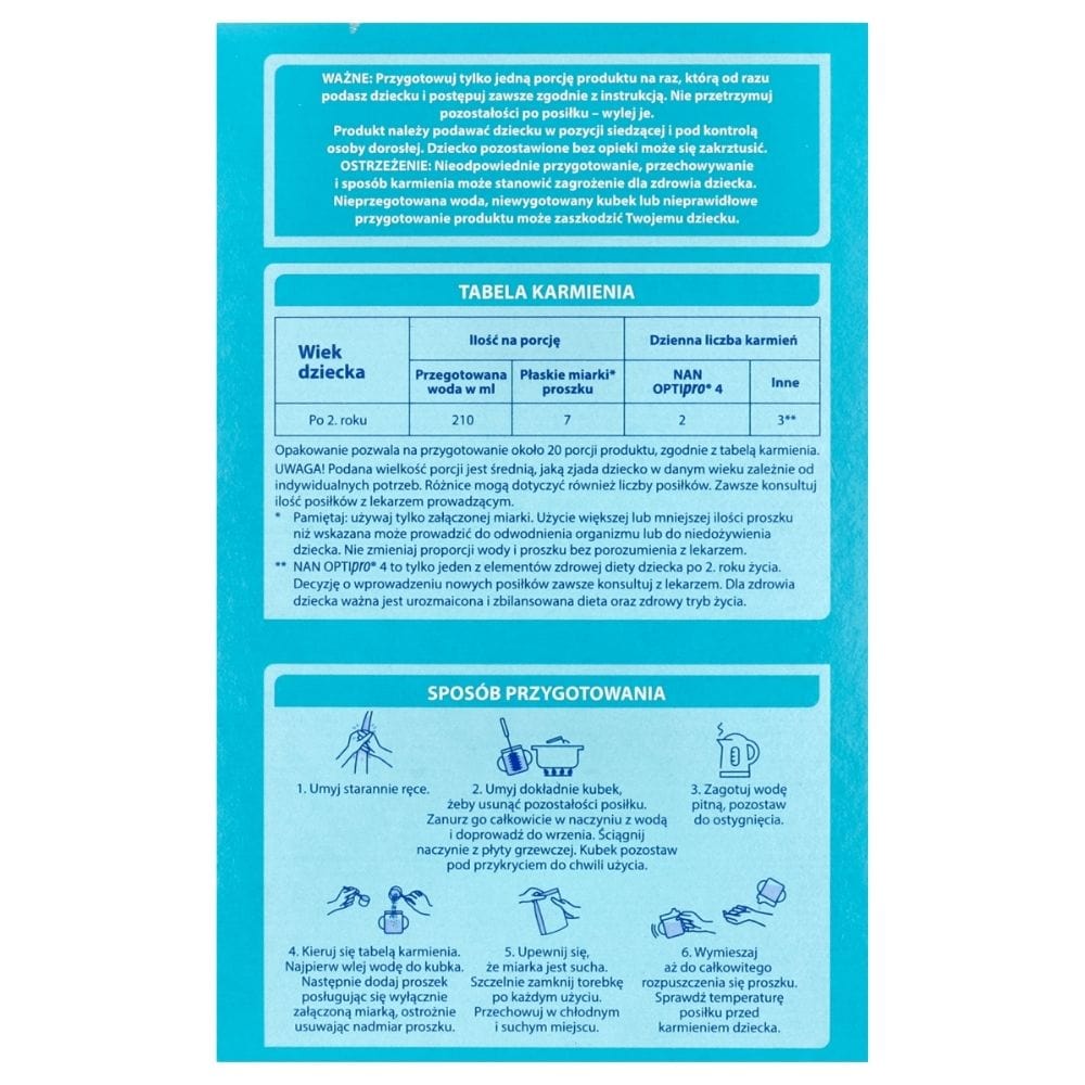 Nestle NAN OPTIpro 4 er et mælkebaseret produkt beregnet til små børn over 2 år. Beriget med vitaminer og mineraler. Det er ikke en erstatning for modermælk, men et produkt designet til at fremme en korrekt sammensætning af barnets kost.