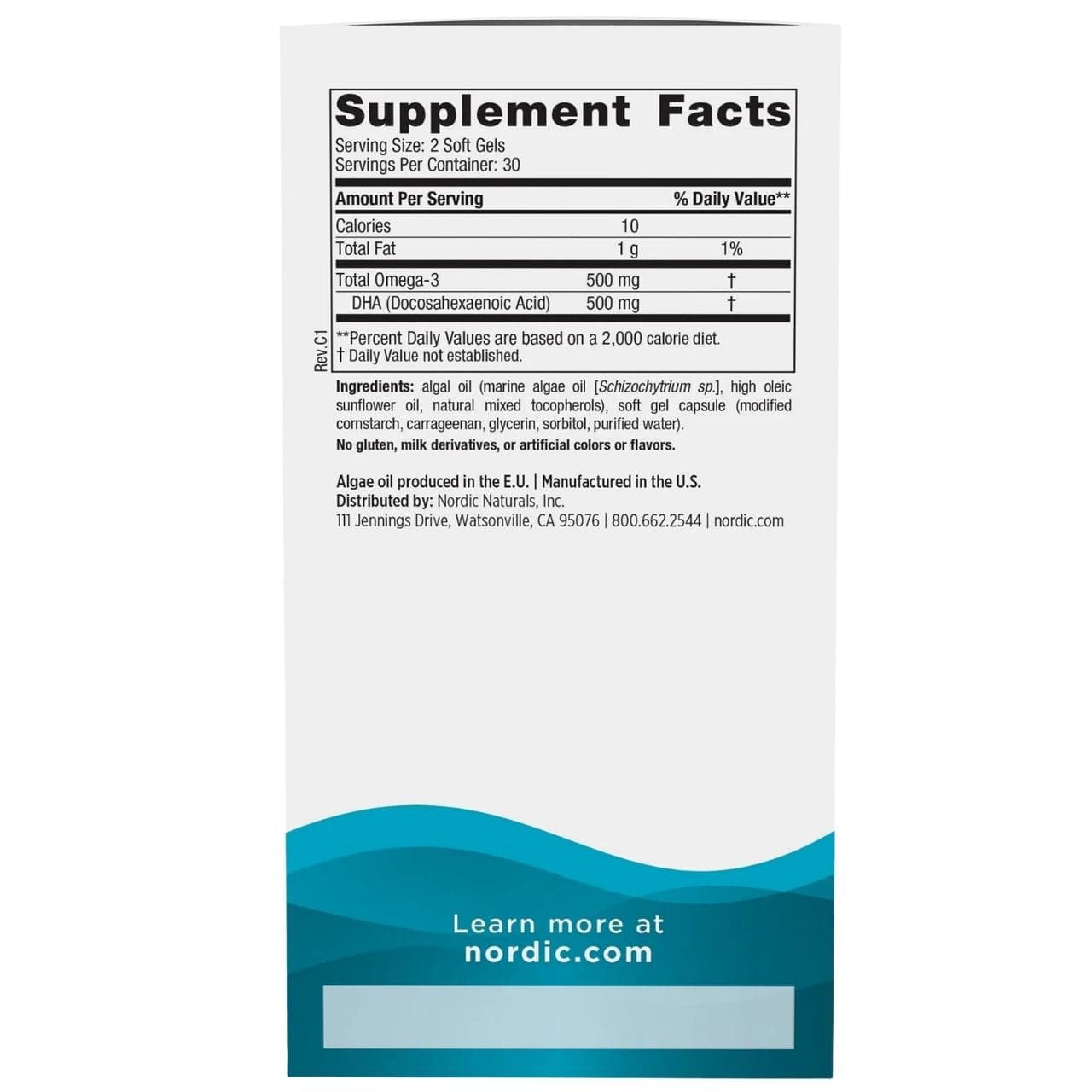 Nordic Naturals Algae DHA er et kosttilskud i gelkapsler. Det indeholder rene omega-3 DHA-syrer udvundet af mikroalger , formuleret til veganere og vegetarer.