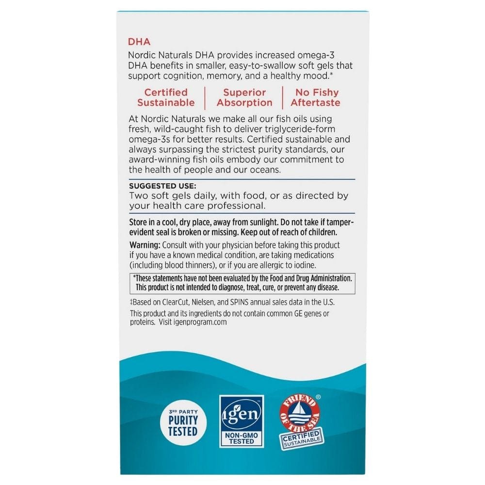 Nordic Naturals DHA er et kosttilskud i gelkapsler. Formlen indeholder 830 mg omega-3 , herunder hele 480 mg DHA (docosahexaensyre).
