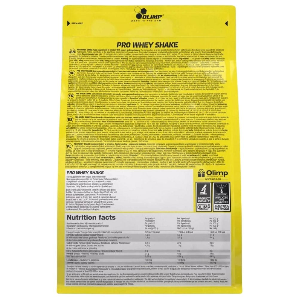 Olimp Pro Whey Shake er et kosttilskud i pulverform. Et proteintilskud skabt til personer med et øget proteinbehov, der ønsker at udvikle muskelmasse, primært professionelle atleter og fritidsudøvere. Det kombinerer tre proteinkilder: hydrolysat, isolat og vallekoncentrat.
