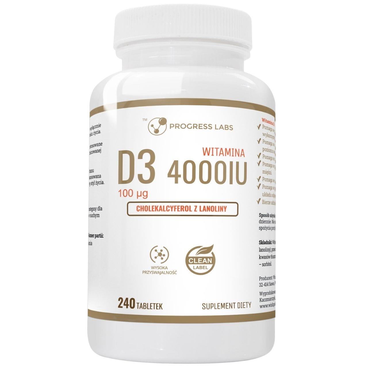 Progress Labs Vitamin D3 4000 IU is a dietary supplement in tablet form containing 100 µg (4000 IU, 2000% RDA) of cholecalciferol obtained from lanolin. Vitamin D contributes to the maintenance of normal bones and teeth, normal absorption of calcium and phosphorus, normal blood calcium levels, normal functioning of the immune system and normal muscle function. Tablets are gluten-free, soy-free, lactose-free and GMO-free. Pack of 240 tablets.