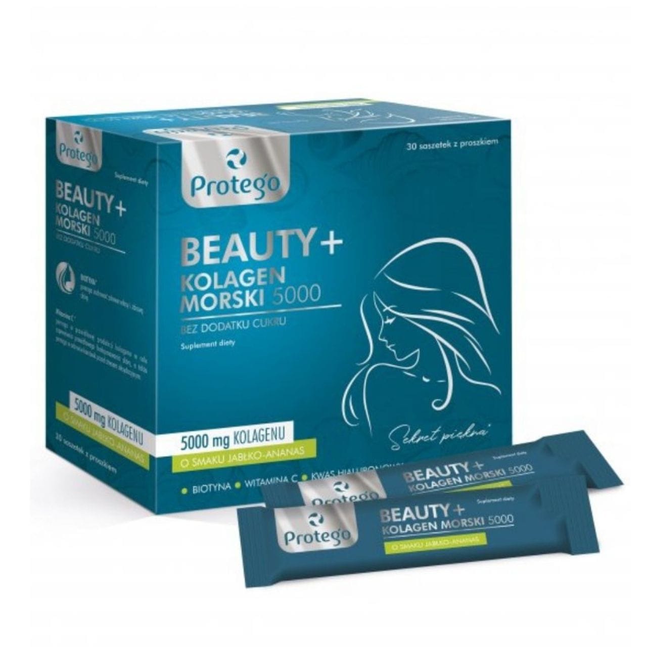 Protego BEAUTY + Marine Collagen 5000 er et kosttilskud i pulverform i praktiske poser. En pose indeholder hele 5,000 mg kollagen, C-vitamin, hyaluronsyre og biotin.