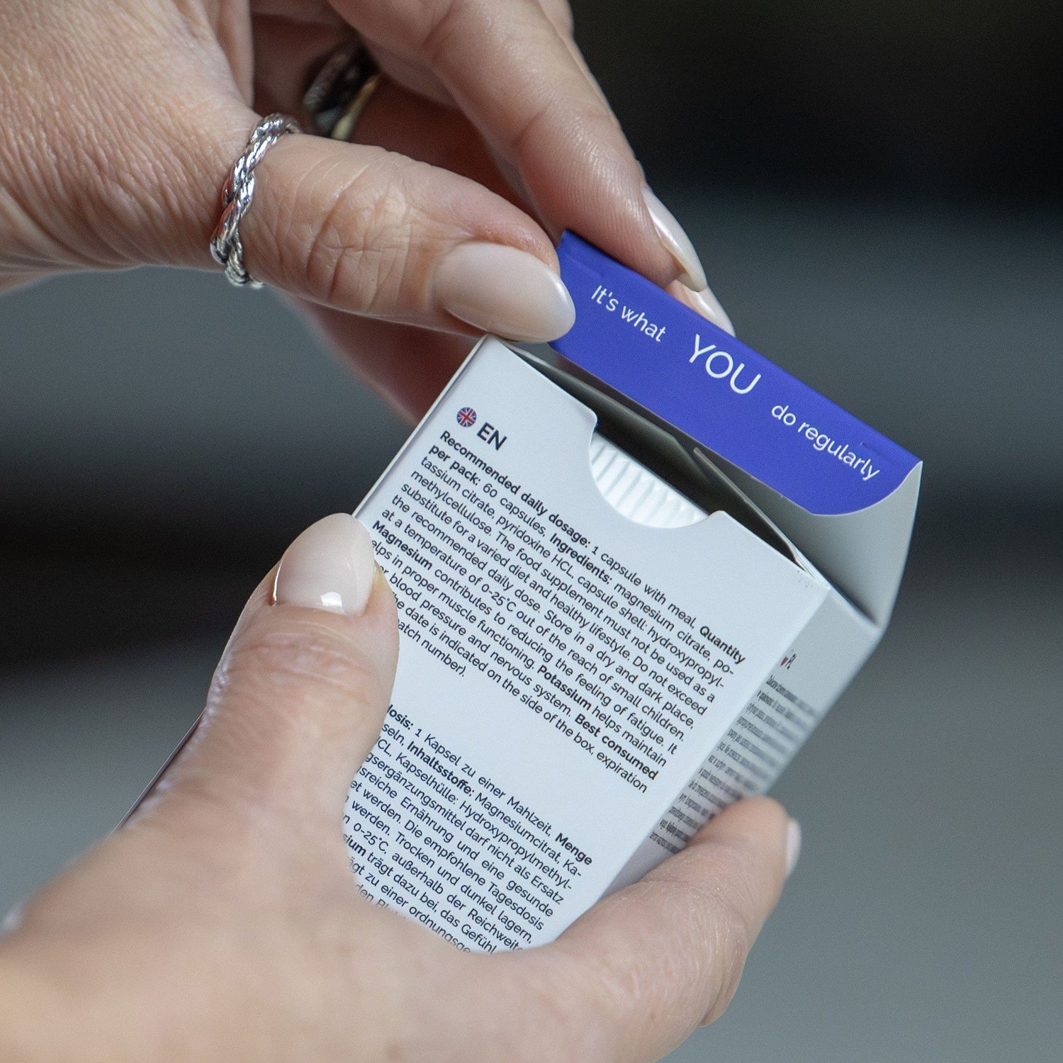 Produktet indeholder 1 00 mg magnesium , 150 mg kalium , og 6 mg vitamin B6. Ren sammensætning , uden unødvendige tilsætningsstoffer. Egnet til veganere.