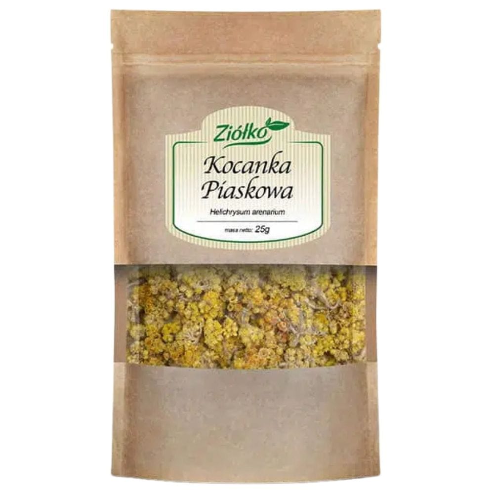 Helichrysum sandwort er en 100% naturlig tørret blomsterstand af en plante, der er værdsat i urtemedicin. Den understøtter leverens og galdeblærens funktion , og har en positiv effekt på nyrerne og urinvejene. Den er kendetegnet ved gyldengule blomster og en delikat krydret aroma. Pakket i en praktisk genlukkelig pose, der bevarer urternes friskhed og aroma.